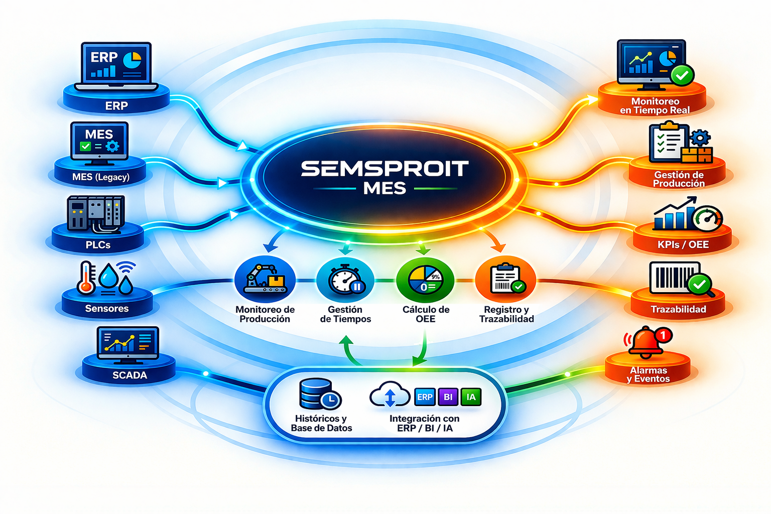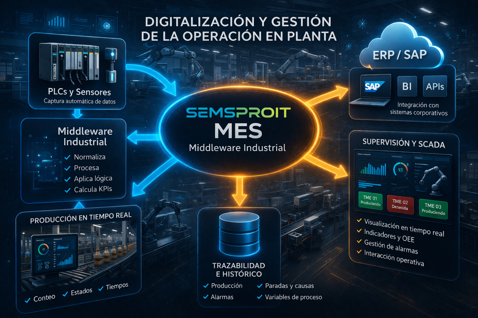 SEMSPROIT como MES (Manufacturing Execution System) se enfoca en la digitalización, contextualización y gestión operativa de la producción en planta en tiempo real.