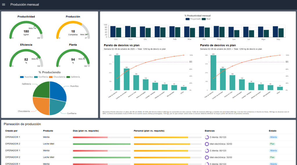 Combina capacidades de Monitoreo y Supervisión para ofrecer una visión completa de las líneas de producción. Permite visualizar en tiempo real tanto los indicadores productivos como las variables críticas.