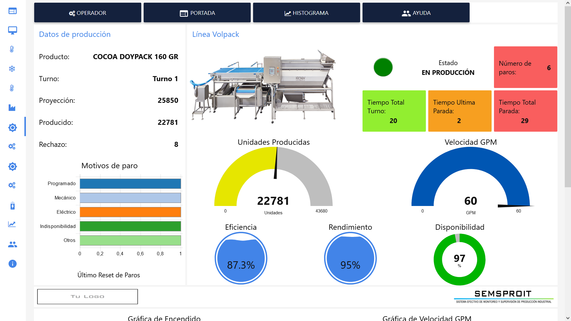 SEMSPROIT Supervisión ofrece una visión clara y continua del desempeño de la operación, mostrando estados de máquina, tiempos de producción y eventos relevantes. Permite visualizar el estado operativo, registrar eventos clave y entender cómo se comporta la producción durante cada turno de trabajo.