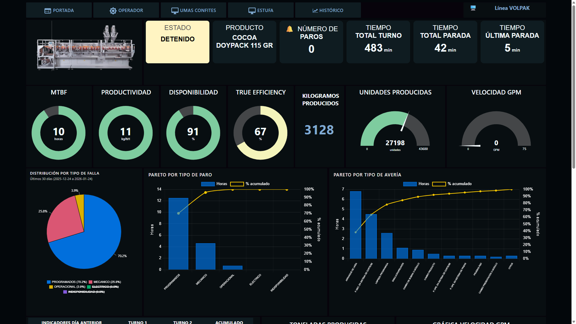 Tiempo en que la línea realmente produce paradas, microparos y arranques tardíos.